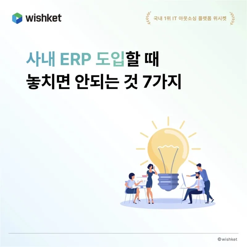 위시켓은 ERP 분야는 물론, IT 분야의 다양한 전문가들이 연결된 국내 1위 IT 아웃소싱 플랫폼입니다. 필요한 요구사항을 간단히 공유하면, 각 분야 전문가들이 구현에 드는 비용과 조언을 제공합니다. 또 위시켓에서 프로젝트마다 1:1로 전담 매니저를 배치해 클라이언트 입장에서 부족한 부분을 지원해 드리고 있습니다.(필요 인력/기술 정리, 미팅&조율, 견적 검토, 계약서 작성 등)